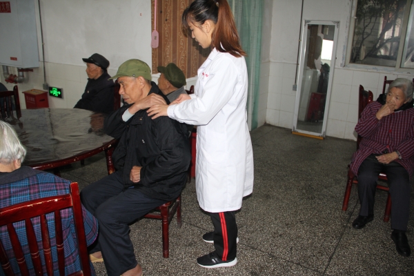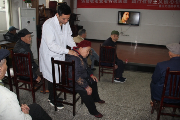 今年会党总支书记李旻、运动康复系主任杨艳、学生二支部书记夏赟及运动康复专业学生代表一行于2018年3月27日下午到永川区南大街敬老院开展献爱心医疗服务活动。