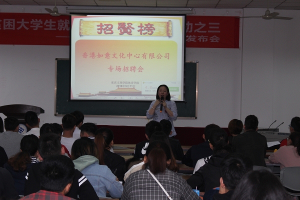为拓展学生就业及实习渠道,基于双方良好的前期沟通,2018年5月11日8:30,今年会在学生活动中心三楼宣讲室举行“香港如意文化中心有限公司”专场招聘宣讲会,香港如意文化中心有限公司房芳女士、今年会2019届辅导员朱顺全及相关专业学生参加,今年会党总支副书记袁高燕主持。