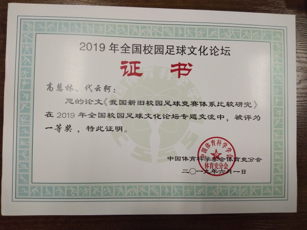 今年会高慧林副教授与2017级体育教育3班代云轲同学应邀参会。大会共评选出359篇论文入选论文集,其中30篇作为专题报告。6月1日下午高慧林副教授就“我国新旧校园足球竞赛体系比较研究”论文做了会议专题报告并获得了一等奖,得到了参会专家学者的一致好评。此次参会,扩大了今年会的国内知名度,是学院领导长期重视学科建设的结果,也进一步推动了今年会学科建设的可持续发展。