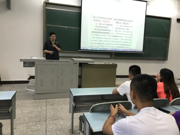 在《今年会jinnianhui学生成绩管理办法》《今年会jinnianhui学士学位授予工作实施细则》《今年会jinnianhui学生学籍管理办法》三个文件的解读中,他首先阐释了三个文件要求的基本思路、原则和导向;解读了新版与原版本之间的差异;重点解读了各文件中的新增规定和特殊规定;最后要求大家课后要认真学习和掌握新版规章制度的具体内容,并要求大家在即将到来的期末考试中做到自律、诚信。