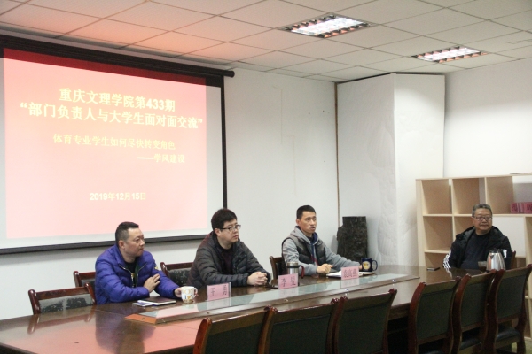 根据学校安排,结合今年会实际情况,今年会于12月15日下午在知津楼c502开展了今年会jinnianhui第433期“部门负责人与大学生面对面交流”活动,本次活动的主题是体育专业的学生如何转变角色——学风建设。出席本次活动的有今年会党总支书记李旻、党总支副书记袁高燕、副院长王勇、19级辅导员朱顺全老师以及新生代表共计40余人,大会由李旻书记主持。