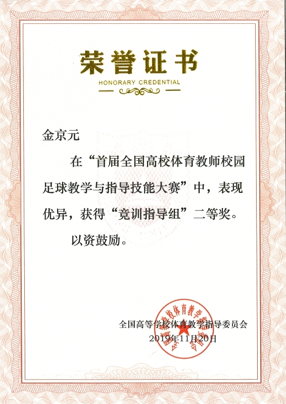 金京元老师获首届全国高校体育教师校园足球教学与指导技能大赛二等奖,在重庆高校中仅次于西南大学;黄嘉良老师获重庆市高校青年教师基本功大赛一等奖。