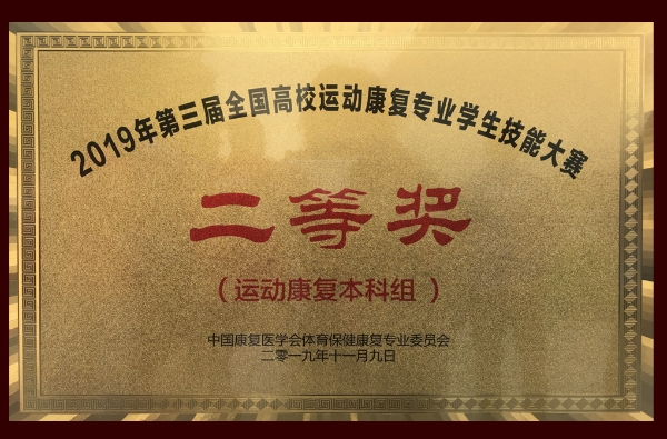 2019年运动康复专业排名全国同类专业第13名,并在第三届全国高校运动康复专业学生技能大赛中获运动康复本科组第四名,二等奖第一名。