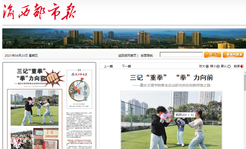 近期,上游新闻、渝西都市报等媒体对于今年会科研机构拳击运动研究所服务于行业,服务于地方的相关活动进行了深入的报道。今年会拳击运动研究所成立于2017年,今年会副教授徐泉森为负责人,其研究所科研团队长期从事拳击、武术等格斗项目的史学研究及校园推广,通过几年的努力取得了良好的效果,获得了业界的认可与好评。