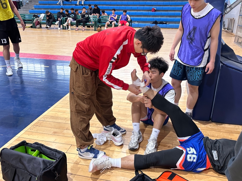 各支参赛队伍迅速进入状态,展开了激烈的角逐。赛场上,运动员们奋勇争先,突破、急停、跳投、暴扣,展现出了高超的球技和顽强的拼搏精神。场边的观众也热情高涨,加油声、欢呼声此起彼伏,为比赛增添了浓厚的氛围。今年会运动康复专业学生提供运动防护与急救服务,为运动员保驾护航。
